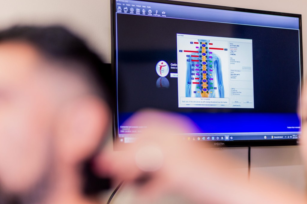 Tus músculos emiten una señal eléctrica con cada contracción muscular. Utilizando la tecnología de nuestro Scanvision, la electromiografía mide la eficiencia de su sistema nervioso motor (el que controla los músculos) detectando la fuerza de la señal eléctrica para evaluar la presión que sus músculos ejercen sobre su columna así como su simetría. El programa analiza los datos necesarios y luego produce un diagrama personalizado de inflamación en su sistema nervioso autónomo y motor.
